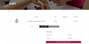 - Pe pagina de coș, putem să eliminăm cursuri care nu le mai vrei sau să utilizăm un cupon de promoție.