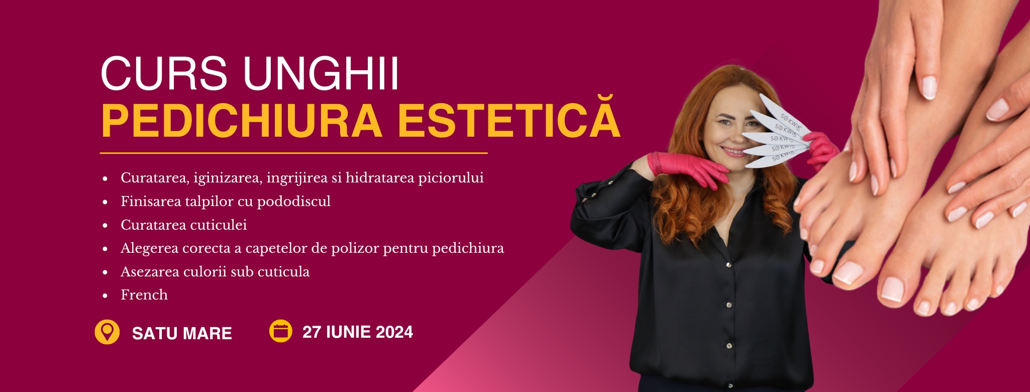 CURS PEDICHIURA ESTETICA Ce vei învăța ? Curatarea, iginizarea, ingrijirea si hidratarea piciorului Finisarea talpilor cu pododiscul Curatarea cuticulei Alegerea corecta a capetelor de polizor pentru pedichiura Asezarea culorii sub cuticula French De ce Wigmond Academy ? Avem o experiență de peste 20 de ani în domeniu Ai ocazia de a învăța numeroase secrete NailArt de la profesioniști renumiți și recunoscuți la nivel internațional La finalul cursului primești CERTIFICAT DE PERFECȚIONARE în Tehnica Tips-uri Reutilizabile Intri într-un grup online privat de suport profesional Pe durata cursului beneficiezi de PROMOȚII SPECIALE pentru achiziționarea......
